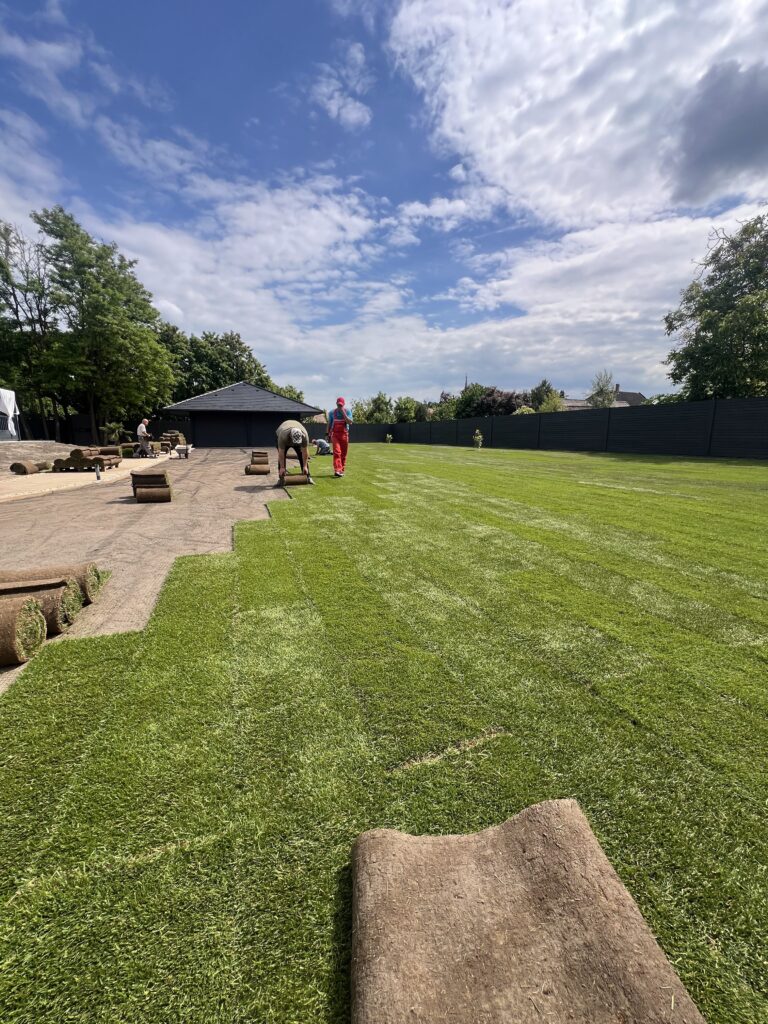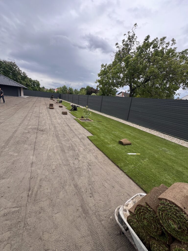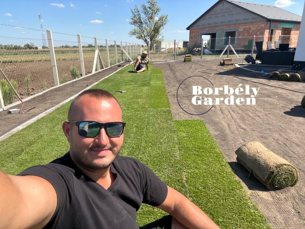 - Gyepszőnyeg fektetés – gondosan egymás mellé illesztve, hézagmentesen.